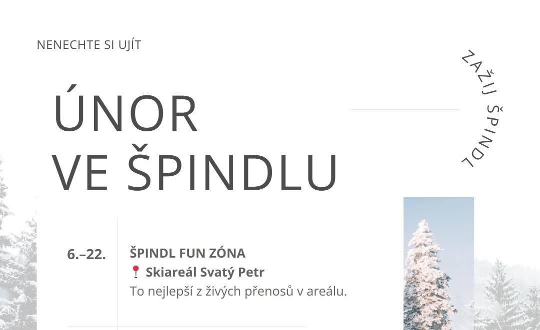 Špindlerův Mlýn v únoru potvrzuje svou pověst živého horského centra, kde se i v zimě stále něco děje. V centru Špindlu se potkává sportovní atmosféra, inspirativní setkávání, gurmánské zážitky i